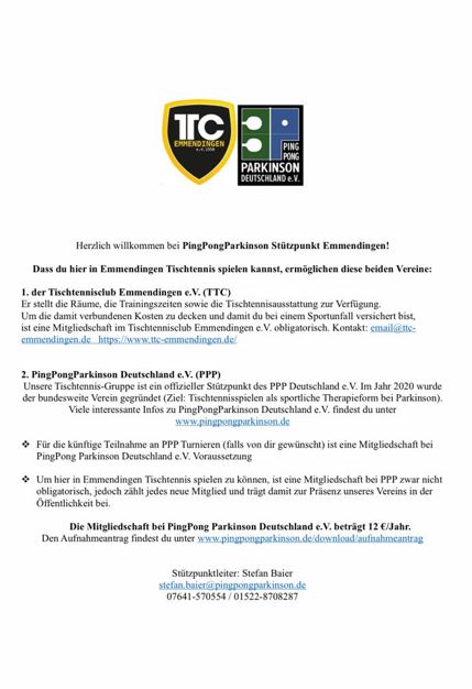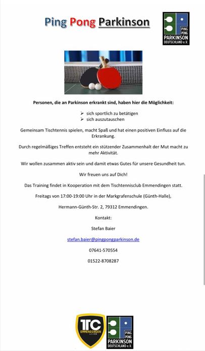 Nähere Informationen erhaltet ihr gerne unter https://www.pingpongparkinson.de/ beim Verein email@ttc-emmendingen.de oder unter den folgenden Flyern und/oder Informationen, siehe unten